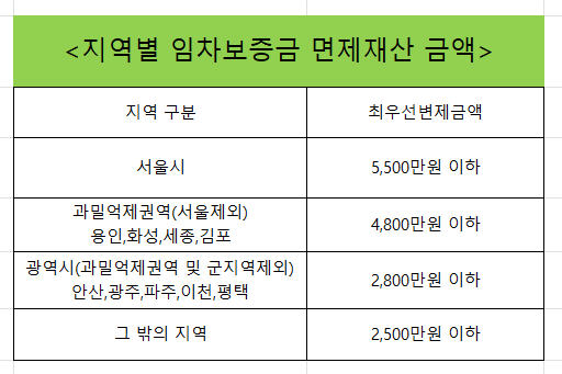 1] 개인회생 채무자가 주거용으로 사용하고 있는 건물의 임차보증금에서 주택임대차보호법에 따라 아래 표와 같이 우선 변제를 받을 수 있는 금액이 개인회생 청산가치에서 면제될 수 있습니다.