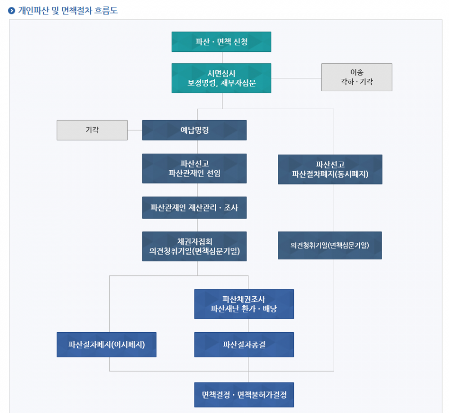 - > 즉, 개인파산과 면책제도는 파산선고 당시에 채무자의 재산으로 파산재단을 형성하여 채권자들에게 배당하는 파산절차와 파산자 중에서 면책불허가 사유가 없는 경우 면책을 결정하는 면책절차로 이루어집니다.