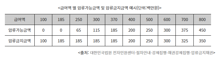 또한 「민사집행법」에 따라 급여의 절반(1/2)은 법적으로 압류가 불가능한 금액으로 정해져 있습니다. 그러나 급여의 1/2에 해당하는 금액이 월 185만 원에 미치지 못하면 185만원까지 압류가 금지됩니다.(참고로 국세 또는 지방세의 체납액 등을 징수하기 위해 급여 채권을 압류하는 경우 압류금지 최저 금액은 250만원입니다.)